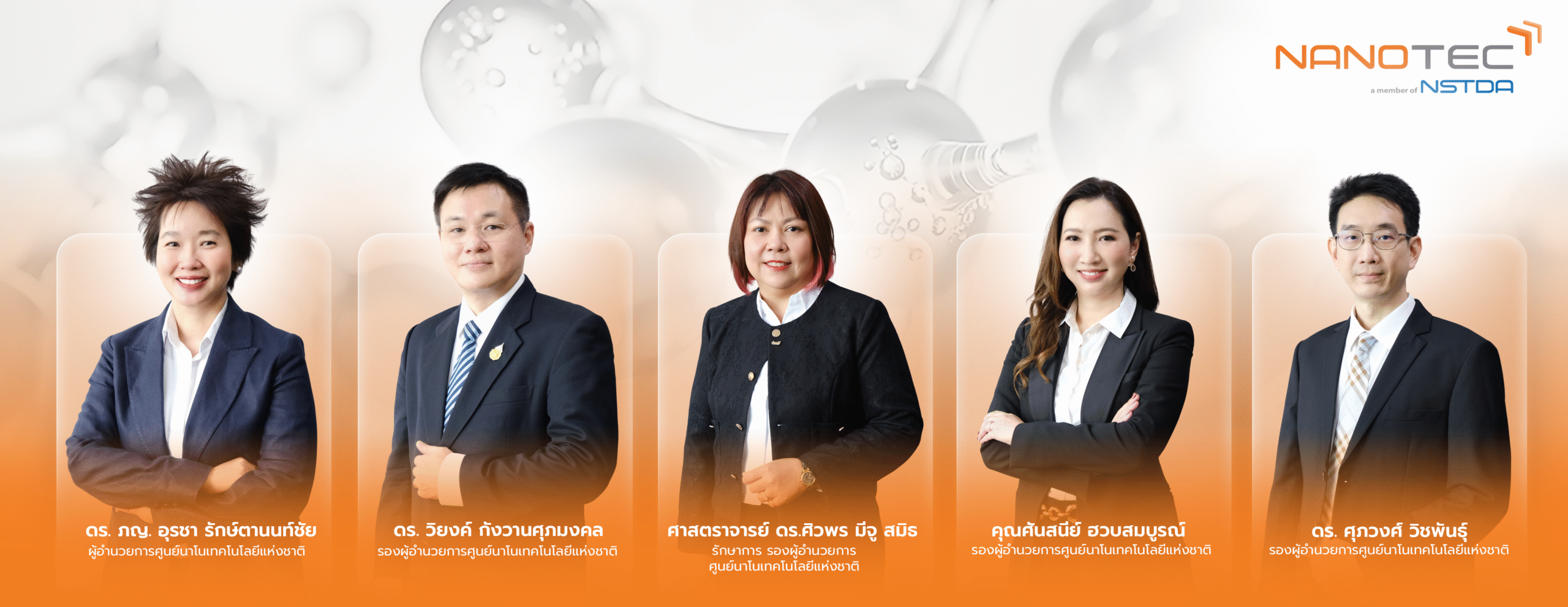 รู้จักนาโนเทค คณะผู้บริหาร คณะกรรมการบริหารศูนย์ฯ ความร่วมมือกับพันธมิตร รู้จักนาโนเทค คณะผู้บริหาร คณะกรรมการบริหารศูนย์ฯ ความร่วมมือกับพันธมิตร คณะผู้บริหาร Our Leaders