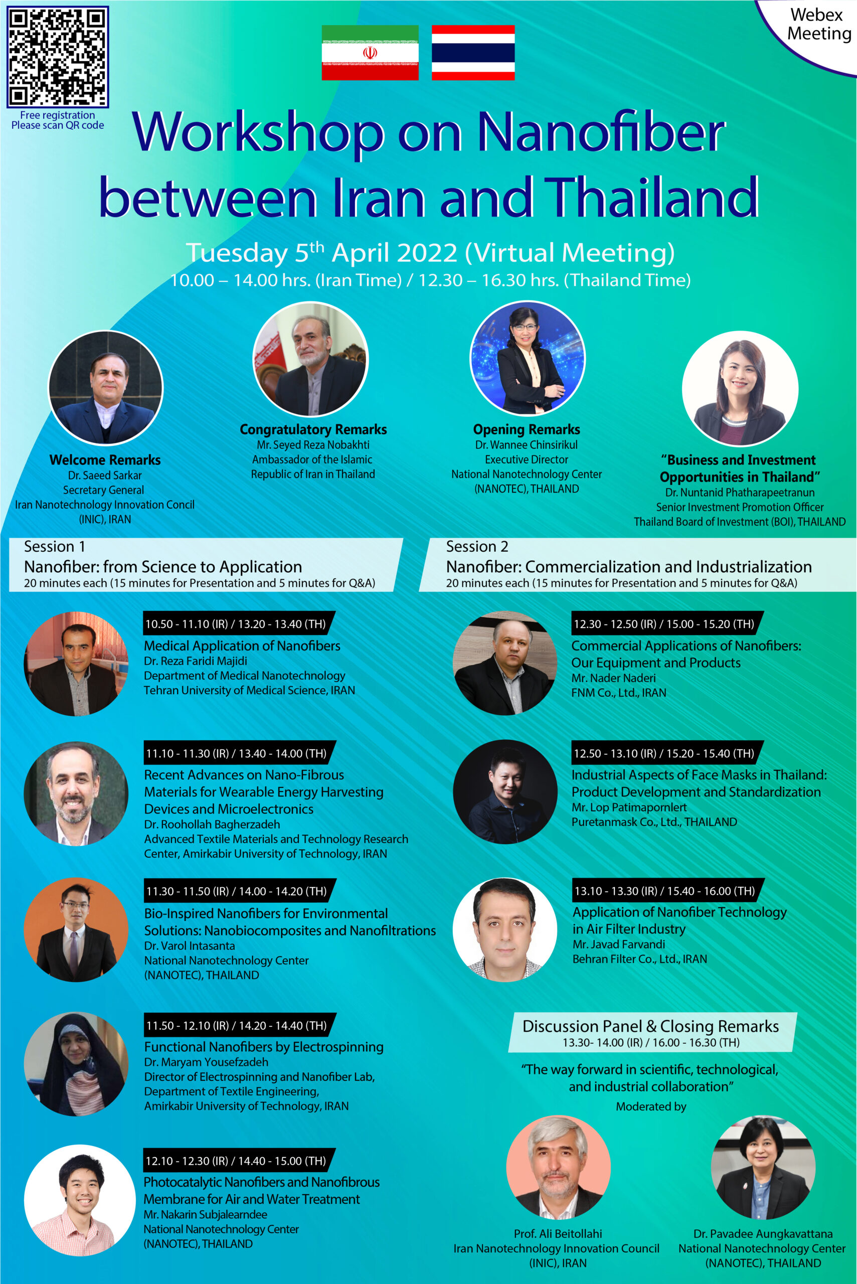 ศูนย์นาโนเทคโนโลยีแห่งชาติ (นาโนเทค) สำนักงานพัฒนาวิทยาศาสตร์และเทคโนโลยีแห่งชาติ (สวทช.) ขอเชิญผู้สนใจเข้าร่วมฟังสัมมนาในหัวข้อ “Workshop on Nanofiber between Iran and Thailand” วันอังคารที่ 5 เมษายน 2565 เวลา 12.30-16.30 น. ในการเปิดงานได้รับเกียรติจาก ดร. วรรณี ฉินศิริกุล ผู้อำนวยการศูนย์นาโนเทคโนโลยีแห่งชาติ และ Dr. Saeed Sarkar, Secretary General of Iran Nano Technology Initiative Council (INIC) ร่วมเป็นประธานเปิดงานสัมมนาออนไลน์