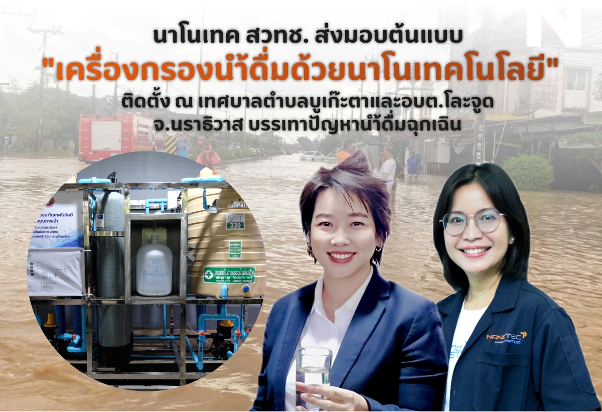 พื้นที่อำเภอแว้ง จังหวัดนราธิวาส เป็นพื้นที่ติดแม่น้ำโกลก ในช่วงปลายปีของทุกปี ปริมาณน้ำฝนจะมากเป็นพิเศษ บางพื้นที่ประสบปัญหาน้ำท่วมบ้านเรือน บางพื้นที่แม้ไม่ได้ประสบปัญหาน้ำท่วม แต่ก็ได้รับผลกระทบอย่างมาก หน่วยงานท้องถิ่นก็ต้องเตรียมงบประมาณจำนวนมากเพื่อจัดเตรียมถุงยังชีพ รวมถึงน้ำสะอาดที่จำเป็นอย่างมากต่อการใช้ชีวิต NANOTEC Newsletter ฉบับนี้ จะพาไปรู้จักต้นแบบ “เครื่องกรองน้ำดื่มด้วยนาโนเทคโนโลยี” พร้อมระบบติดตามคุณภาพน้ำและอุปกรณ์ตรวจวัดคุณภาพน้ำ ที่ดร. อุรชา รักษ์ตานนท์ชัย ผู้อำนวยการศูนย์นาโนเทคโนโลยีแห่งชาติ (นาโนเทค) พร้อมด้วย ดร. ณัฏฐพร พิมพะ ผู้อำนวยการกลุ่มวิจัยการเร่งปฏิกิริยาระดับนาโน การดูดซับและการคำนวณ ร่วมเดินทางไปส่งมอบให้แก่สำนักงานเทศบาลตำบลบูเก๊ะตา และองค์การบริหารส่วนตำบลโละจูด จังหวัดนราธิวาส เพื่อเป็นแหล่งน้ำสะอาดสำหรับช่วยเหลือและบรรเทาทุกข์ประชาชนกรณีเกิดสาธารณภัยหรือภัยพิบัติฉุกเฉิน ขับเคลื่อนการใช้ประโยชน์จากผลงานวิจัย