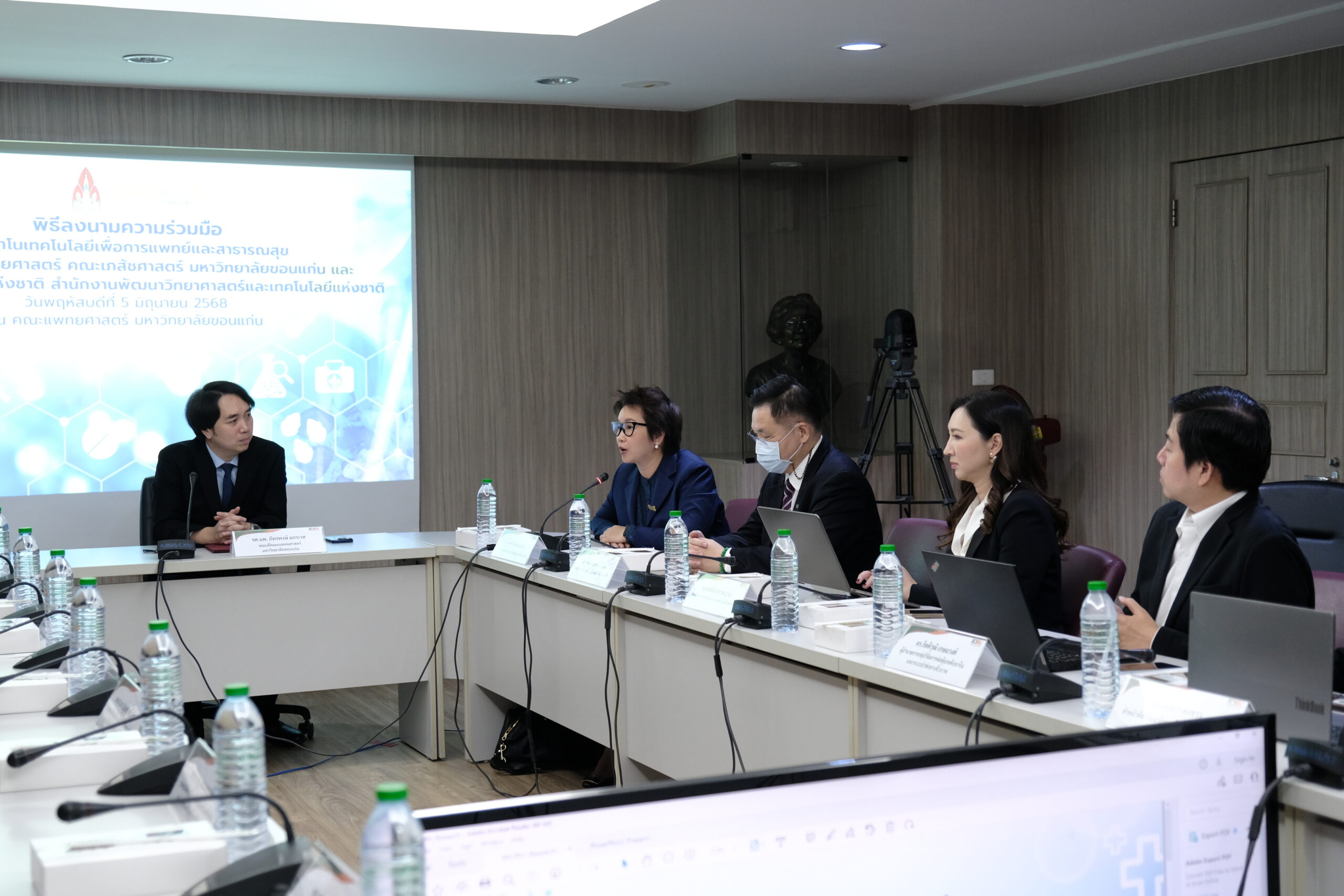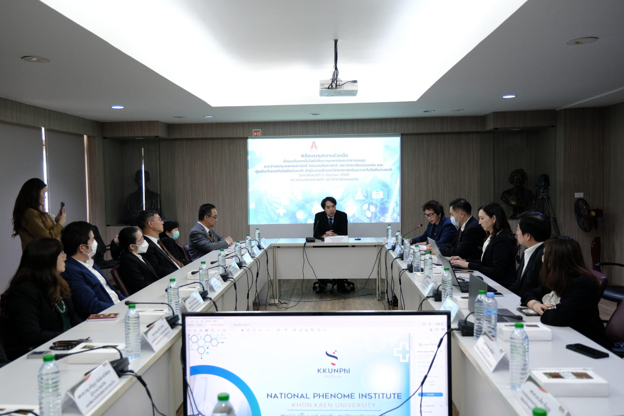 ดร. อุรชา รักษ์ตานนท์ชัย ผู้อำนวยการศูนย์นาโนเทคโนโลยีแห่งชาติ (นาโนเทค) สวทช. , รศ. ภัทรพงษ์ มกรเวส คณบดีคณะแพทยศาสตร์ และ ผศ.ดร. เภสัชกรนรินทร์ จันทร์ศรี คณบดีคณะเภสัชศาสตร์ มหาวิทยาลัยขอนแก่น (มข.) ร่วมลงนามความร่วมมือทางวิชาการด้านนาโนเทคโนโลยีเพื่อการแพทย์และสาธารณสุข เพื่อสร้างเครือข่ายความร่วมมือการวิจัยและพัฒนานาโนเทคโนโลยีด้านการแพทย์และสาธารณสุข โดยมี, ศ. นพ. ภพ โกศลารักษ์ ผู้อำนวยการสถานบริหารจัดการงานวิจัยคลินิก (Advanced Clinical Research Organization: ACRO) มข. ดร. วิยงค์ กังวานศุภมงคล รองผู้อำนวยการ คุณศันสนีย์ ฮวบสมบูรณ์ รองผู้อำนวยการ ดร.กิตติวุฒิ เกษมวงศ์ ผู้อำนวยการกลุ่มวิจัยการห่อหุ้มระดับนาโนและระบบนำส่งทางชีวภาพ นาโนเทค และทีมวิจัย ร่วมเป็นสักขีพยาน