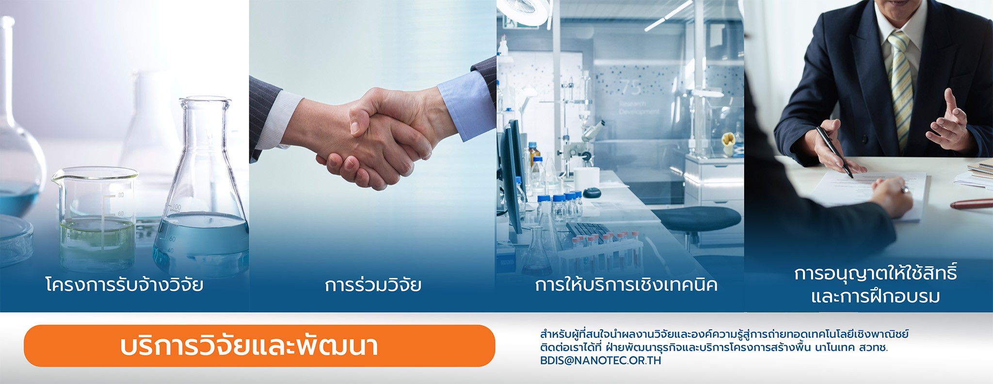 ศูนย์นาโนเทคโนโลยีแห่งชาติ (นาโนเทค) สำนักงานพัฒนาวิทยาศาสตร์และเทคโนโลยีแห่งชาติ หน่วยงานวิจัยชั้นนำด้านนาโนเทคโนโลยีของประเทศ ที่มีความพร้อมครบวงจรทั้งบุคลากรวิจัยและพัฒนา เครื่องมือและโครงสร้างพื้นฐานเฉพาะทางระดับสากล รวมถึงเครือข่ายความร่วมมือกับมหาวิทยาลัย ภาครัฐ และภาคเอกชน โดยนาโนเทคมุ่งเน้นการนำผลงานวิจัยและองค์ความรู้สู่การถ่ายทอดเทคโนโลยีเชิงพาณิชย์ ในรูปแบบโครงการรับจ้างวิจัย การร่วมวิจัย การอนุญาตสิทธิใช้ประโยชน์ การให้บริการเชิงเทคนิค การวิเคราะห์ทดสอบทางกายภาพ การวิเคราะห์ทดสอบประสิทธิภาพและความปลอดภัย การพัฒนาต้นแบบ การฝึกอบรมและการดำเนินการร่วมกับภาคอุตสาหกรรมในด้านธุรกิจเชิงสังคม