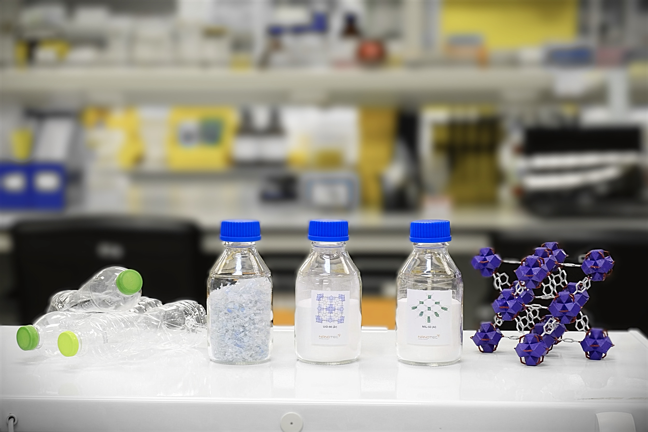 นอกจากนี้ ทีมวิจัยยังให้ความสำคัญกับการผลิต MOFs โดยใช้แนวคิดเศรษฐกิจหมุนเวียน (Circular Economy) เพื่อหมุนเวียนวัสดุเหลือใช้กลับมาใช้ประโยชน์ เช่น การย่อยสลายขวดน้ำดื่มพลาสติกเพื่อนำมาใช้แทนสารอินทรีย์ลิแกนด์ (organic ligand) ซึ่งเป็นสารตั้งต้นสำคัญในการสังเคราะห์ MOFs หลายชนิดรวมถึงการสังเคราะห์ MOFs จากโลหะที่ได้จากของเสียอุตสาหกรรม เช่น mill scale จากอุตสาหกรรมเหล็ก และโลหะจากน้ำยากัดแผงวงจรพิมพ์ ทั้งนี้ ทีมได้พัฒนาระบบการสังเคราะห์แบบต่อเนื่อง (continuous synthesis system) ควบคู่ไปกับการปรับกระบวนการผลิตตามหลักการเคมีสีเขียว (green chemistry) เพื่อให้สามารถขยายกำลังการผลิตได้อย่างมีประสิทธิภาพ พร้อมลดผลกระทบต่อสิ่งแวดล้อมจากกระบวนการผลิตไปพร้อมกัน ในด้านการใช้งาน ทีมวิจัยได้ออกแบบการขึ้นรูป MOFs ในหลากหลายรูปแบบเพื่อให้เหมาะสมกับการประยุกต์ใช้จริงในอุตสาหกรรม เช่น การขึ้นรูปเป็นเม็ด การเคลือบบนวัสดุรองรับ (support) และการขึ้นรูปเป็นเมมเบรนในลักษณะแผ่นหรือท่อกลวง ซึ่งช่วยให้ MOFs สามารถนำไปใช้งานได้สะดวก มีความทนทาน และมีประสิทธิภาพในการดูดซับหรือกรองสารปนเปื้อนได้ดียิ่งขึ้น