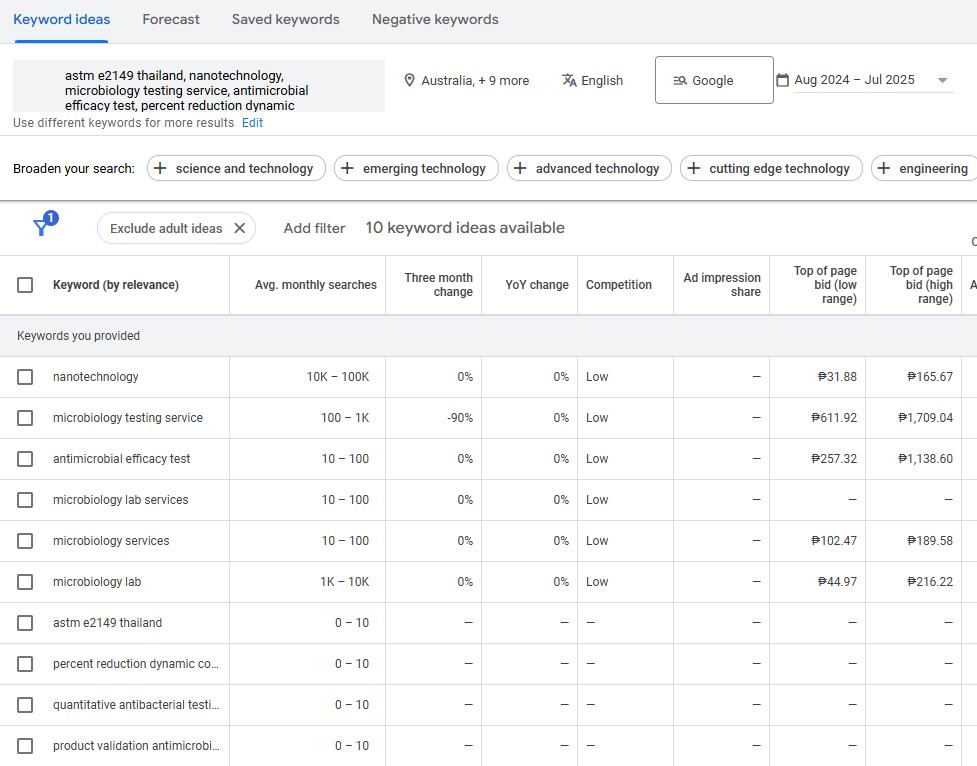 - ASTM E2149 (dynamic contact, % reduction): from THB 3,000 per sample per organism