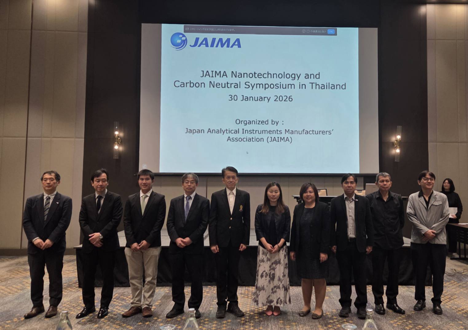 30 January 2026 – The National Nanotechnology Center (NANOTEC), participated the Japan Analytical Instruments Manufacturers’ Association (JAIMA) annual Symposium which collaborating with government agencies, research institutes, universities, and companies from Thailand and Japan. For the symposium this year, JAIMA has chosen the theme “Nanotechnology and Carbon Neutrality”. This event provided an opportunity by sharing experiences and expertise from related organizations and companies from Thailand and Japan to introduce research results, relevant technologies, and measures aimed at realizing a carbon-neutral society through advanced nanotechnology. Representatives from the Embassy of Japan in Thailand, researchers and analytic equipment companies were gathered for this symposium. Prof. Dr. Siwaporn Meejoo Smith, acting deputy executive director of NANOTEC, addressed recent situations of nanotechnology development in Thailand including strategic focuses of NANOTEC. Align with the symposium theme, Dr. Kajornsak Faungnawakij, presented “Future Trends of Low-Carbon Technologies for a Sustainable Economy” to update stakeholders about recent research and development on Carbon Capture, Utilization and Storage in Thailand towards Carbon Neutrality and Net-Zero.