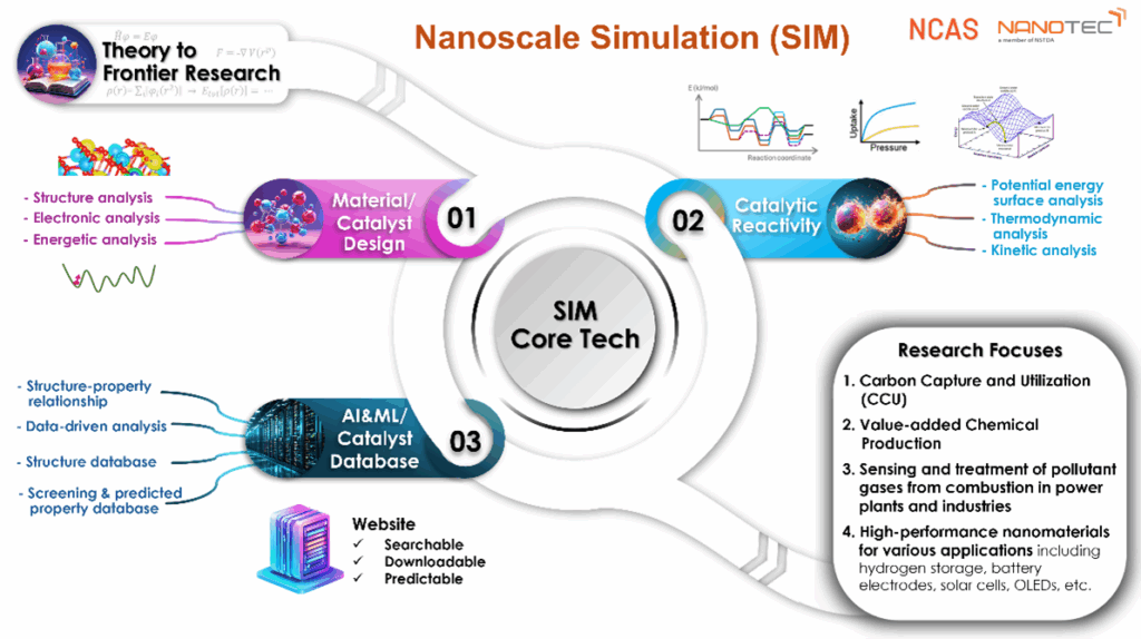 The Nanoscale Simulation Research Team (SIM) has extensive expertise in nanoscale modeling and simulation, delivering both foundational scientific insights and practical industrial significance. We focus on designing and predicting the properties of functional nanomaterials, as well as developing a deep understanding of physicochemical processes at the nanoscale. Our expertise spans advanced computational methods—including first principles computational approaches, molecular dynamics, Monte Carlo simulations, microkinetic modeling and machine learning—which enable us to conduct in-depth analyses of molecular interactions, thermodynamics, kinetics, electronic and optical properties. These ‘in silico’ insights provide the fundamental knowledge to accelerate the development of nanotechnology solutions in clean energy, carbon capture and utilization (CCU), and sustainable value-added chemical production—all with a commitment toward achieving carbon neutrality and a sustainable future.