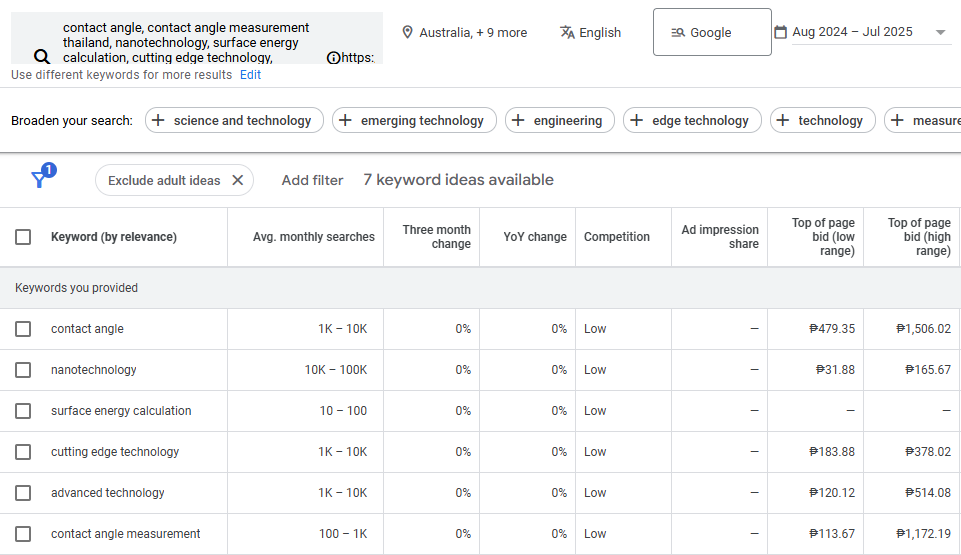 SEO Keywords: contact angle, cutting edge technology, advanced technology, contact angle measurement, contact angle measurement thailand, nanotechnology, surface energy calculation, wettability hydrophilic hydrophobic, multi-liquid contact angle, coatings films adhesion, packaging printability test, cosmetics substrate testing, polymer surface treatment, electronics surface cleanliness