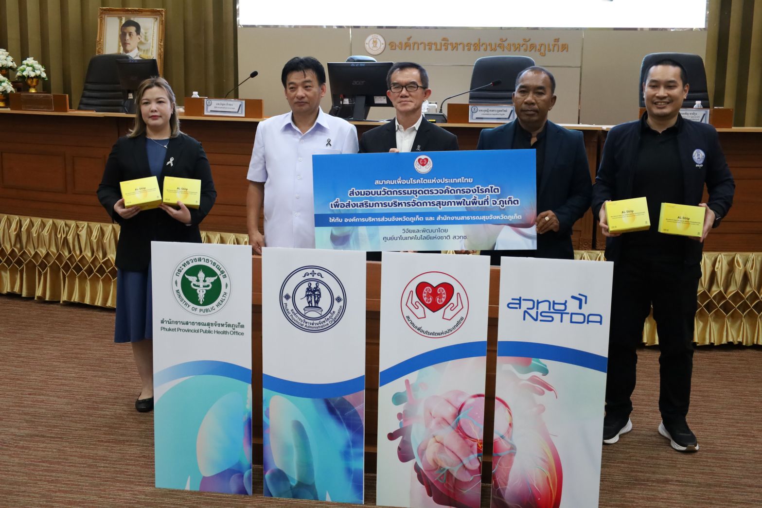 21 มกราคม 2569 ณ องค์การบริหารส่วนจังหวัดภูเก็ต – กระทรวงการอุดมศึกษา วิทยาศาสตร์ วิจัยและนวัตกรรม (อว.) สำนักงานพัฒนาวิทยาศาสตร์และเทคโนโลยีแห่งชาติ (สวทช.) โดย ศูนย์นาโนเทคโนโลยีแห่งชาติ (นาโนเทค) ร่วมกับมูลนิธิเพื่อนโรคไตแห่งประเทศไทย สำนักงานสาธารณสุขจังหวัดภูเก็ต และองค์การบริหารส่วนจังหวัดภูเก็ต ขยายผลนวัตกรรมชุดตรวจคัดกรองโรคไตสู่การใช้ประโยชน์ ผ่านโรงพยาบาลส่งเสริมสุขภาพตำบล/โรงพยาบาลในสังกัด 21 แห่ง ศูนย์การแพทย์ 4 แห่ง และโรงพยาบาล 4 แห่ง หวังคัดกรองประชาชนในพื้นที่ได้ทันท่วงที รับแนวคิดการดูแลเชิงป้องกัน (Preventive care) เพื่อดูแลสุขภาวะของประชากรไทยอย่างยั่งยืน