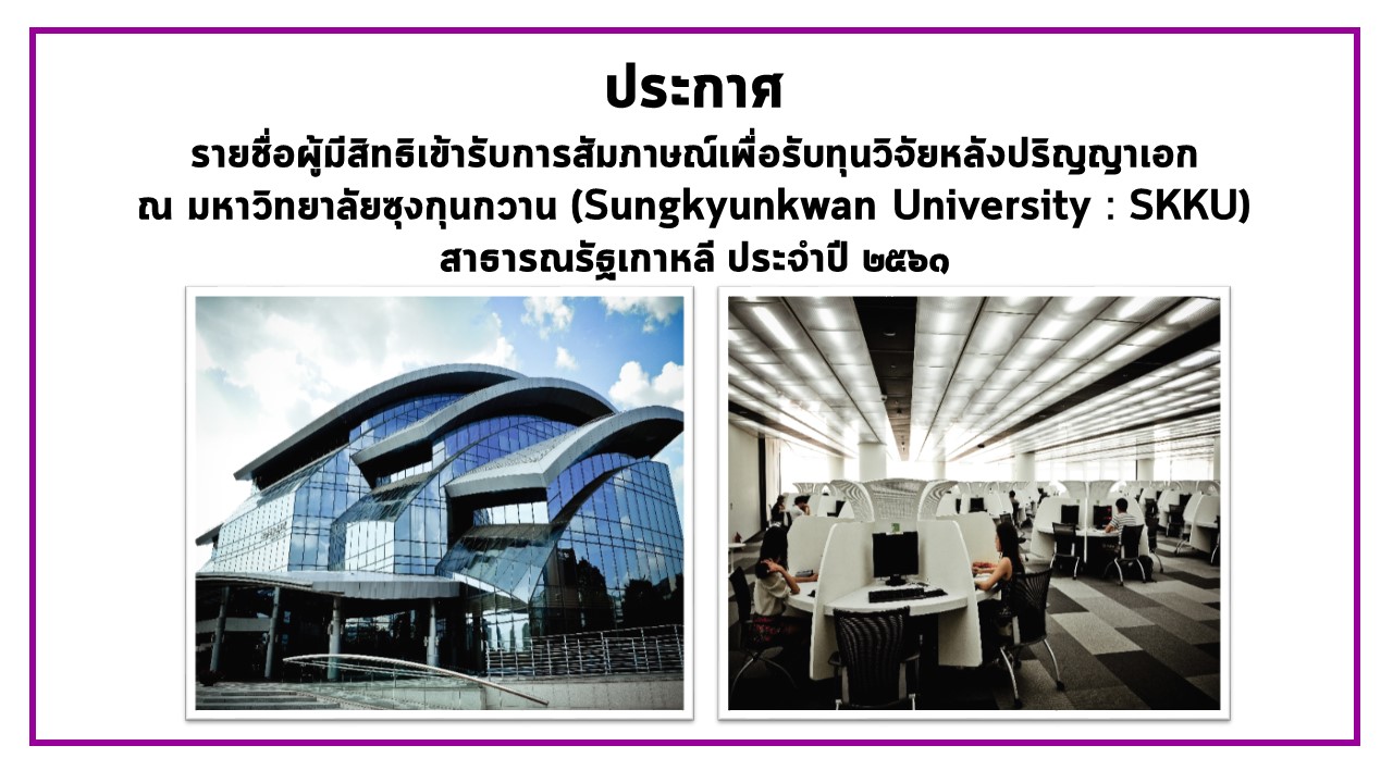 ประกาศรายชื่อผู้มีสิทธิเข้ารับการสัมภาษณ์เพื่อรับทุนวิจัยหลังปริญญาเอก ณ มหาวิทยาลัยซุงกุนกวาน (Sungkyunkwan University : SKKU) สาธารณรัฐเกาหลี ประจำปี 2561