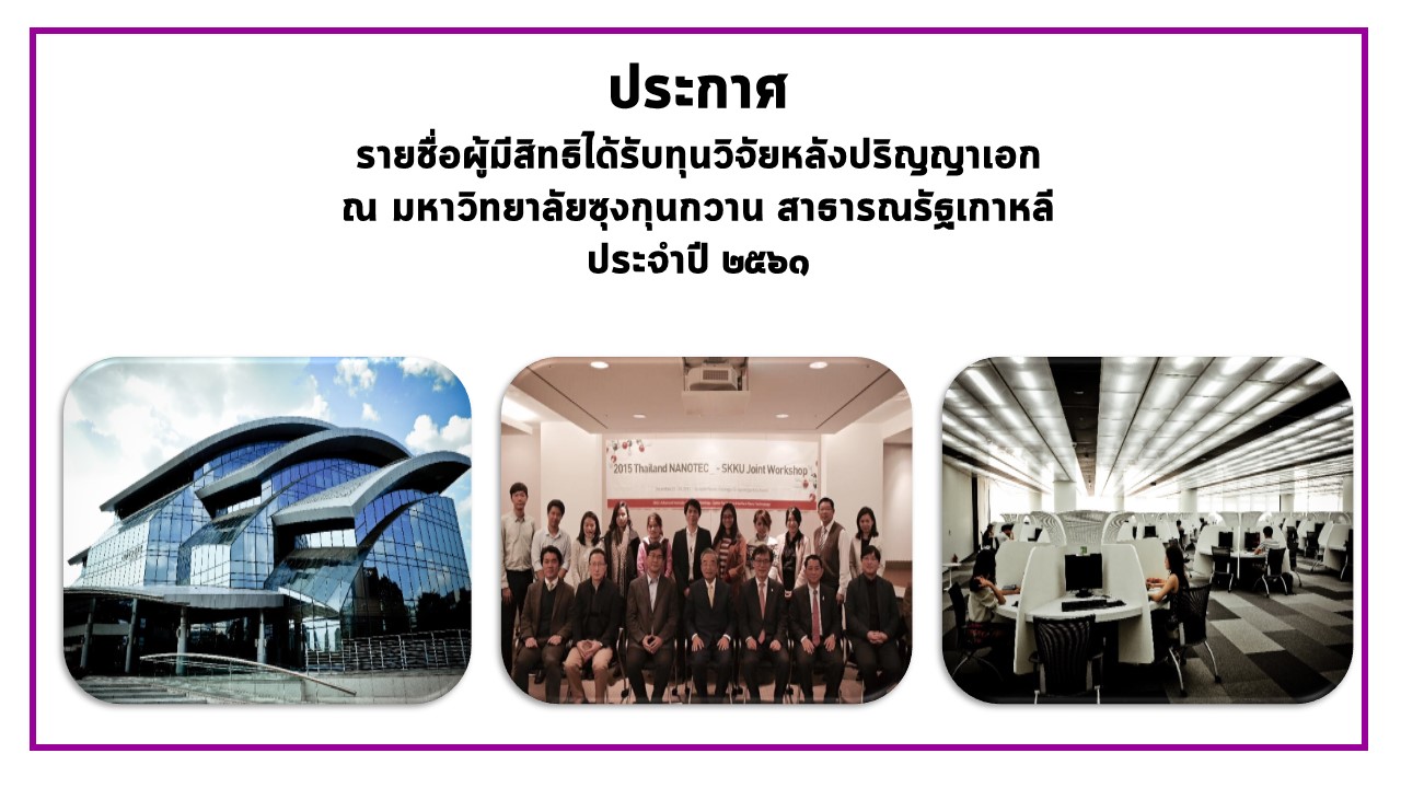 ประกาศรายชื่อผู้มีสิทธิได้รับทุนวิจัยหลังปริญญาเอก ณ มหาวิทยาลัยซุงกุนกวาน สาธารณรัฐเกาหลี ประจำปี ๒๕๖๑