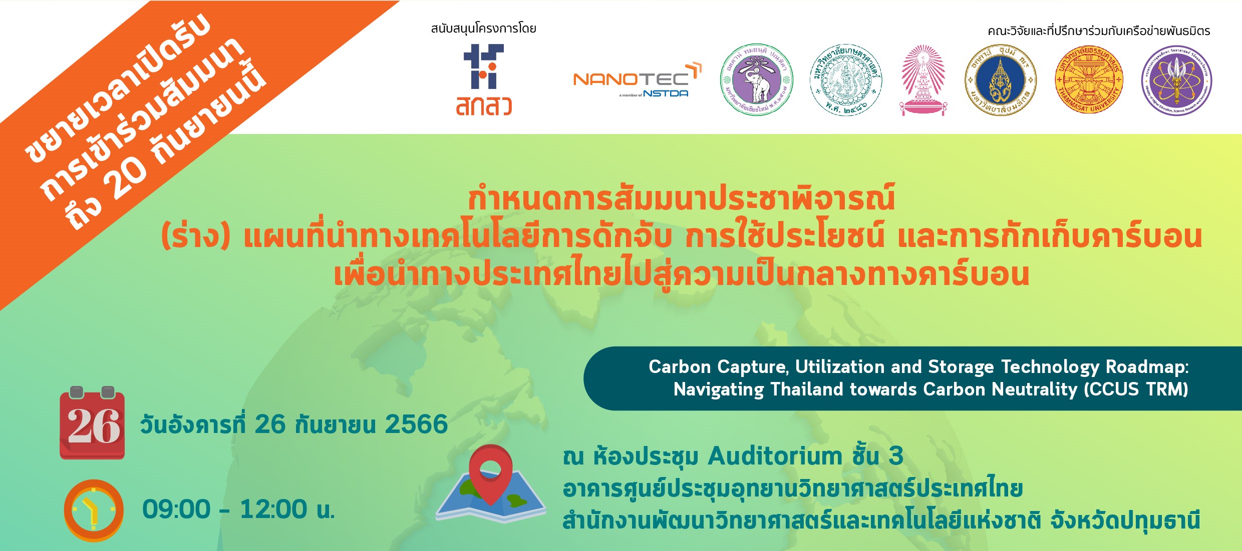 ขยายเวลาเปิดรับเข้าร่วมสัมมนาประชาพิจารณ์ (ร่าง) แผนที่นำทางเทคโนโลยีการดักจับการใช้ประโยชน์ และการกักเก็บคาร์บอน เพื่อนำทางประเทศไทยไปสู่ความเป็นกลางทางคาร์บอน เป็นวันพุธที่ 20 กันยายนนี้