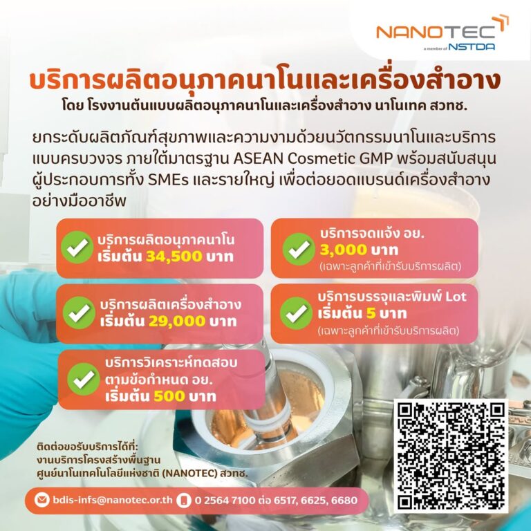 - การผลิตระดับทดลอง (สูตรเครื่องสำอางนาโน): เริ่มต้นที่ 29,000 บาทต่อสูตรตำรับ