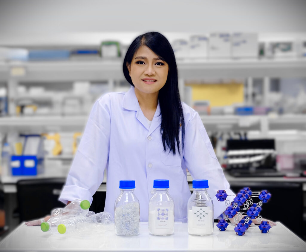 “ด้วยความที่ MOFs เป็นวัสดุลูกผสม (hybrid material) ที่ประกอบไปด้วย ส่วนที่เป็นโลหะและสารอินทรีย์ ทีมวิจัยจึงมองเห็นโอกาส พัฒนากระบวนการย่อยพอลิเอทิลีนเทเรฟทาเลตจากขวดพลาสติกมาแทนที่ส่วนประกอบที่เป็นสารอินทรีย์ หรือออร์แกนิค ลิแกนด์ (organics ligand) ซึ่งเป็นสารตั้งต้น พร้อมพัฒนาสูตร/กระบวนการในการสังเคราะห์ MOFs นำร่อง ชนิด UiO-66 จากโลหะเซอร์โคเนียม (zirconium) และ MIL-53 จากโลหะอลูมิเนียม(aluminum) ด้วยแนวคิดเคมีสีเขียว (Green Chemistry) โดย MOFs ดังกล่าว มีสมบัติในการดูดซับคาร์บอนไดออกไซด์หรือ CO2” ดร. ชลิตากล่าว