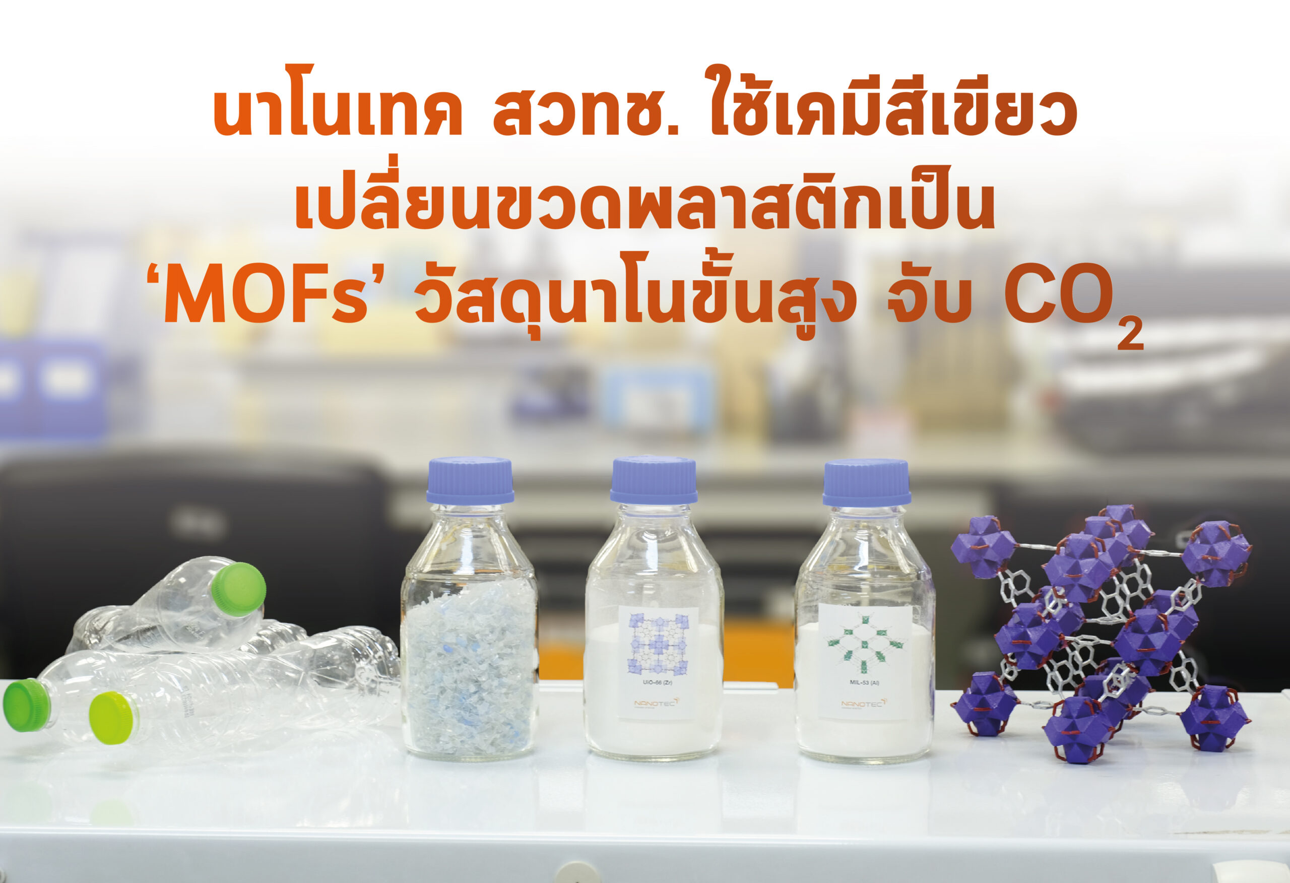 ดร.ชลิตา รัตนเทวะเนตร จากทีมวิจัยนาโนเทคโนโลยีเพื่อสิ่งแวดล้อม กลุ่มวิจัยวัสดุผสมและการเคลือบนาโน ศูนย์นาโนเทคโนโลยีแห่งชาติ (นาโนเทค) สำนักงานพัฒนาวิทยาศาสตร์และเทคโนโลยีแห่งชาติ (สวทช.) กล่าวว่า ขวดน้ำพลาสติกที่ทำมาจากพอลิเอทิลีนเทเรฟทาเลต (PET) นั้น นับเป็นขยะที่พบได้จำนวนมากในทุกๆ วัน ในขณะเดียวกัน ก็สามารถนำกลับมาใช้ใหม่ได้หลากหลายรูปแบบ ซึ่งหนึ่งในนั้นคือ การใช้ วทน. ในการเปลี่ยนขยะขวดพลาสติกให้เป็นวัสดุนาโนมูลค่าสูงอย่าง MOFs