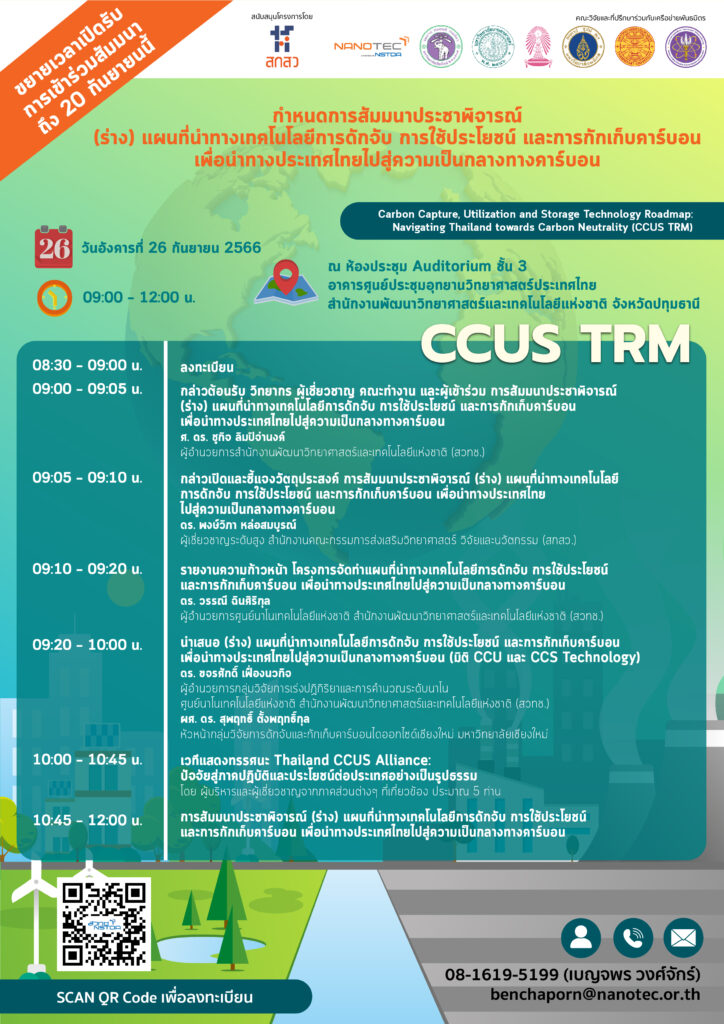 นาโนเทค สวทช. ขอเชิญร่วมการสัมมนาประชาพิจารณ์ (ร่าง) แผนที่นำทางเทคโนโลยีการดักจับการใช้ประโยชน์ และการกักเก็บคาร์บอน เพื่อนำทางประเทศไทยไปสู่ความเป็นกลางทางคาร์บอน