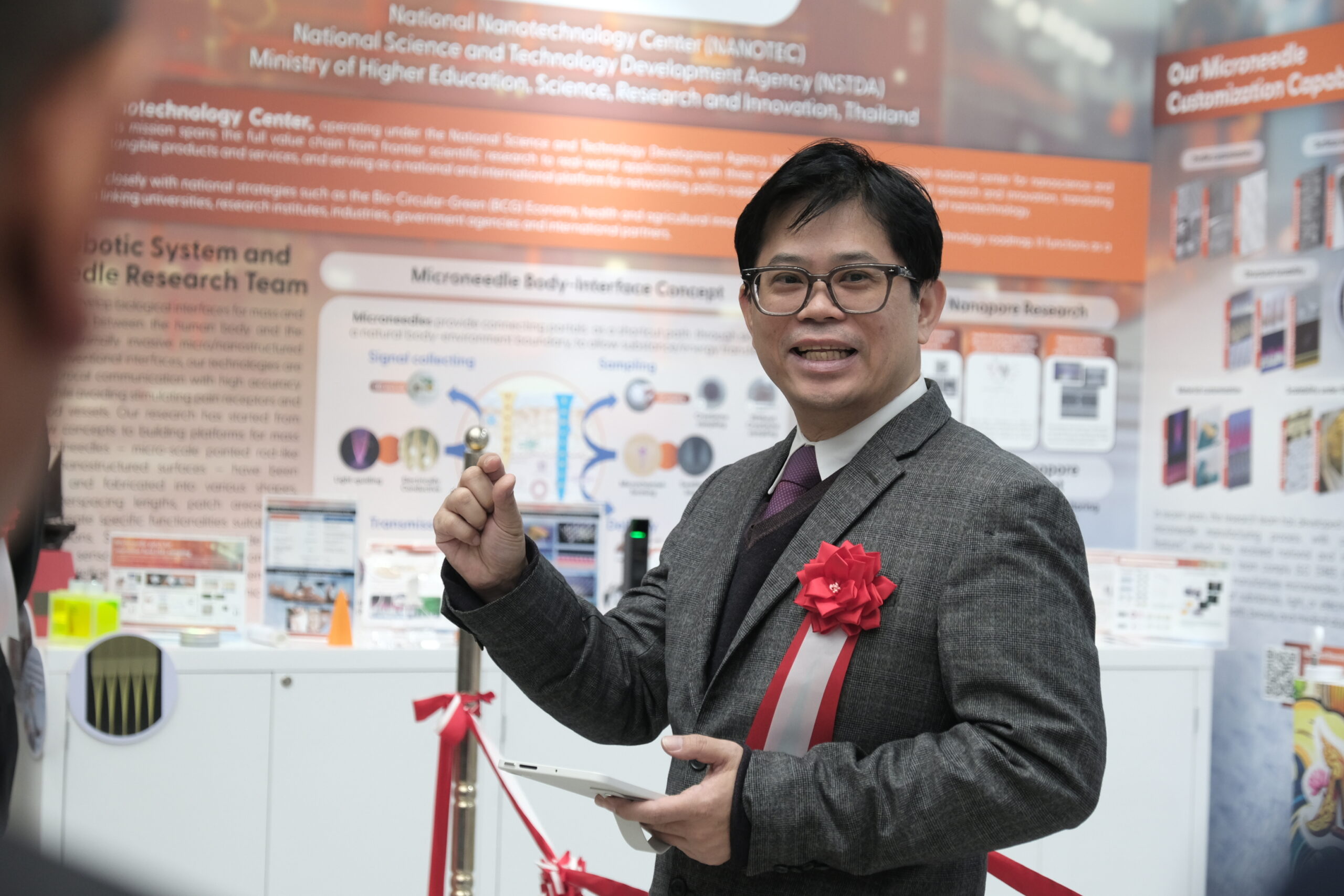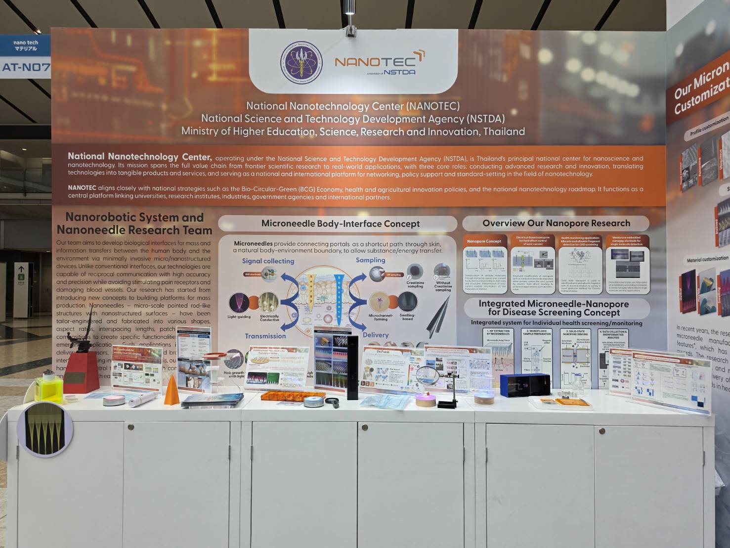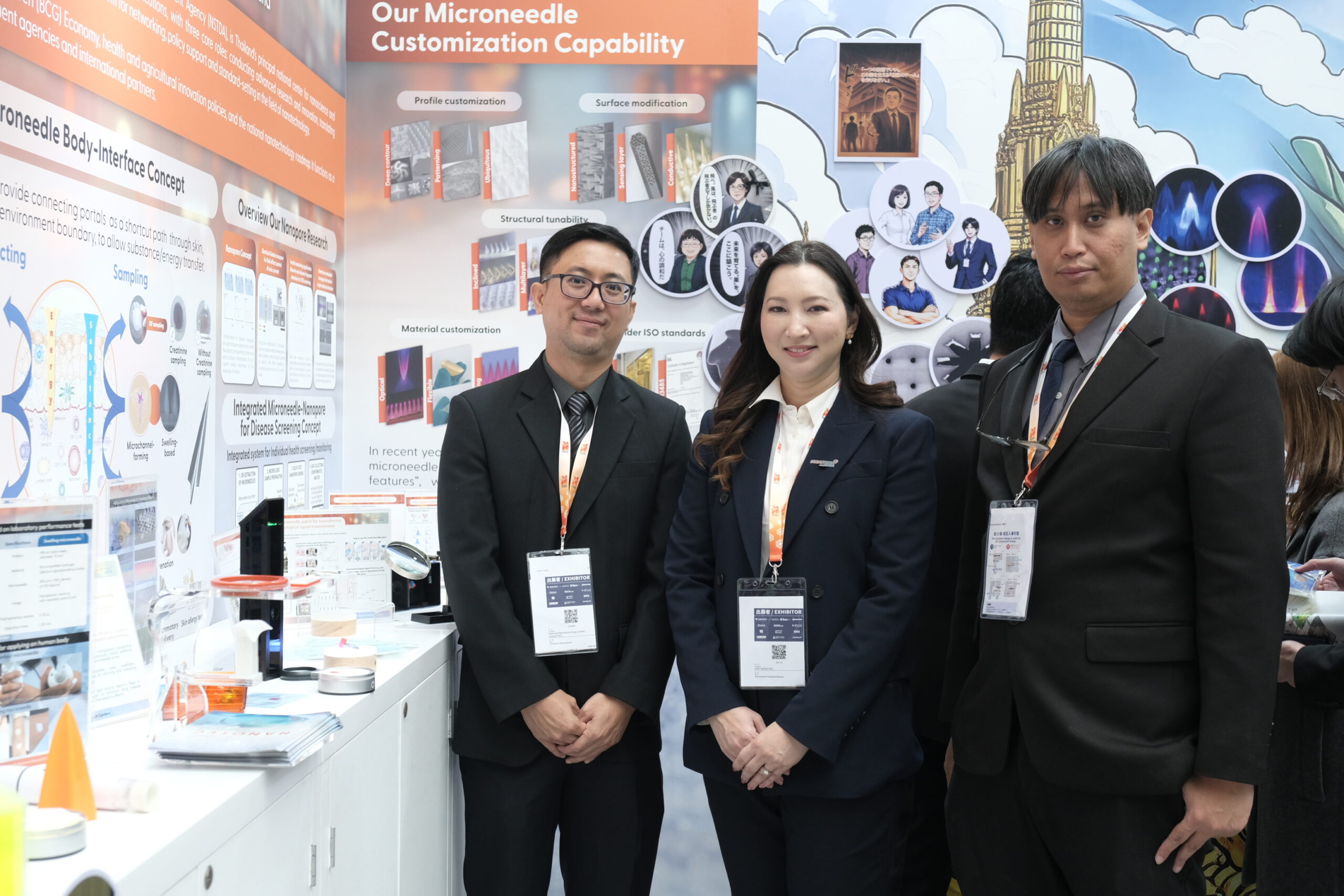 ดร.ภญ. อุรชา รักษ์ตานนท์ชัย ผู้อำนวยการศูนย์นาโนเทคโนโลยีแห่งชาติ (นาโนเทค) สวทช. กล่าวว่า ภายในงานนี้ นาโนเทคได้ร่วมนำเสนองานวิจัยการพัฒนาเข็มขนาดไมโครเมตร ผ่าน Microspike Technology Pavilion ร่วมกับบริษัทสตาร์ตอัป นับเป็นตัวอย่างที่ชัดเจนของการนำผลงานวิจัยต่อยอดสู่การใช้ประโยชน์เชิงพาณิชย์ อาทิ เทคโนโลยีไมโครนีดเดิลสำหรับการทดสอบภูมิแพ้ผ่านผิวหนัง การเก็บตัวอย่างของไหลระหว่างเซลล์ใต้ผิวหนัง การนำส่งสารและแสงผ่านผิวหนัง แพลตฟอร์มนาโนพอร์สำหรับการตรวจวัดสิ่งบ่งชี้ทางชีวภาพ พร้อมกันนี้ยังมีการจัดแสดงผลิตภัณฑ์จาก บริษัท สไปก์ อาร์ชิ เทคโทนิคส์ จำกัด ดีปเทคสตาร์ตอัป สวทช. ที่ได้นำงานวิจัยต่อยอดไปสู่ “เทคโนโลยีไมโครสไปก์” และพันธมิตรจากประเทศญี่ปุ่น บริษัท Furutaka Electronics Co., Ltd. ซึ่งสะท้อนให้เห็นถึงการเชื่อมโยงอย่างเป็นรูปธรรมระหว่างงานวิจัยกับโอกาสทางธุรกิจ
