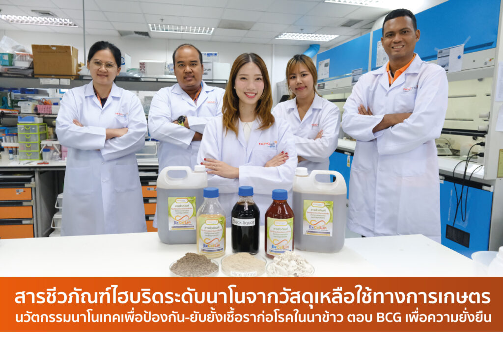 ทีมวิจัยนาโนเทค สวทช. พัฒนา 3 ต้นแบบผลิตภัณฑ์ คือ ลิกนิน ที่มีสมบัติในการป้องกันเชื้อราก่อโรคในข้าว ซึ่งเหมาะที่จะใช้ก่อนเกิดโรคไหม้ข้าว, ลิกนินผสมสารสกัดธรรมชาติ ที่นอกจากสามารถป้องกันและยับยั้งเชื้อราก่อโรคแล้ว ยังเสริมประสิทธิภาพของสารสกัดธรรมชาติ ต้นแบบสุดท้ายคือ ลิกนินผสมสารสกัดธรรมชาติและพอลิเมอร์ธรรมชาติ ช่วยเพิ่มความสามารถในการยึดเกาะของสารออกฤทธิ์และเพิ่มประสิทธิภาพในป้องกันและยับยั้งเชื้อราที่ก่อโรคไหม้ข้าว รวมถึงมีธาตุอาหารหลักที่ช่วยบำรุงต้นข้าวอีกด้วย นอกจากนี้ สารชีวภัณฑ์ดังกล่าวยังสามารถใช้ร่วมกับชีวภัณฑ์เชื้อราไตรโคเดอร์มาได้โดยไม่เป็นปฏิปักษ์กัน