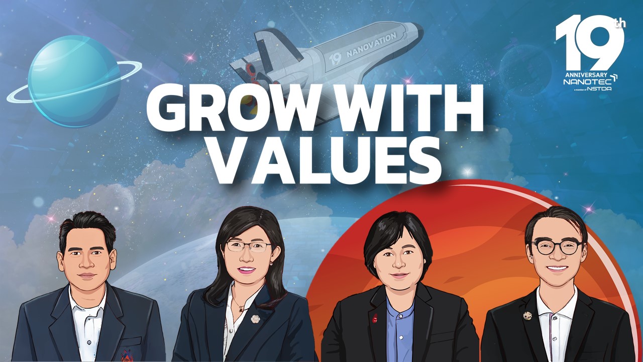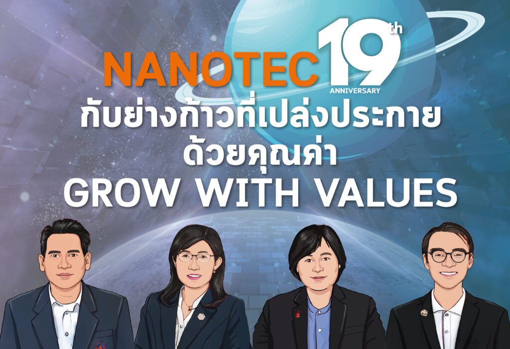 ความสำเร็จในการดำเนินงานอันเกิดจากความสามารถของบุคลากรนาโนเทค ความร่วมมือจากพันธมิตรและผลงานที่ได้รับการยอมรับจากเวทีทั้งในและต่างประเทศล้วนเกิดจากความพยายามและศักยภาพที่เพิ่มขึ้นทุกขวบปี นาโนเทคหรือศูนย์นาโนเทคโนโลยีแห่งชาติ สำนักงานพัฒนาวิทยาศาสตร์และเทคโนโลยีแห่งชาติ (สวทช.) ในปีที่ 19 อยู่ระหว่างการเติบโตที่เปล่งประกายท่ามกลางวิกฤตต่าง ๆ NANOTEC Newsletter ฉบับนี้ จะพาทุกคนไปร่วมฟังพี่ๆ ผู้บริหารทั้ง 4 คนของนาโนเทค คือ พี่ฉิน-ดร.วรรณี ฉินศิริกุล ผู้อำนวยการ, พี่หน่อง-ผศ.ดร.ธนากร โอสถจันทร์ รักษาการรองผู้อำนวยการ, พี่ใหม่-ดร.สุธี ผู้เจริญชนะชัย รองผู้อำนวยการ และพี่จูน-ดร.ภาวดี อังค์วัฒนะ รองผู้อำนวยการ ที่จะมาบอกการเดินทาง ความท้าทาย ความสำเร็จ และเป้าที่เราปักธงไว้ว่าจะไปให้ถึง ภายในงาน NANOTEC 19th Anniversary: Grow with VALUES