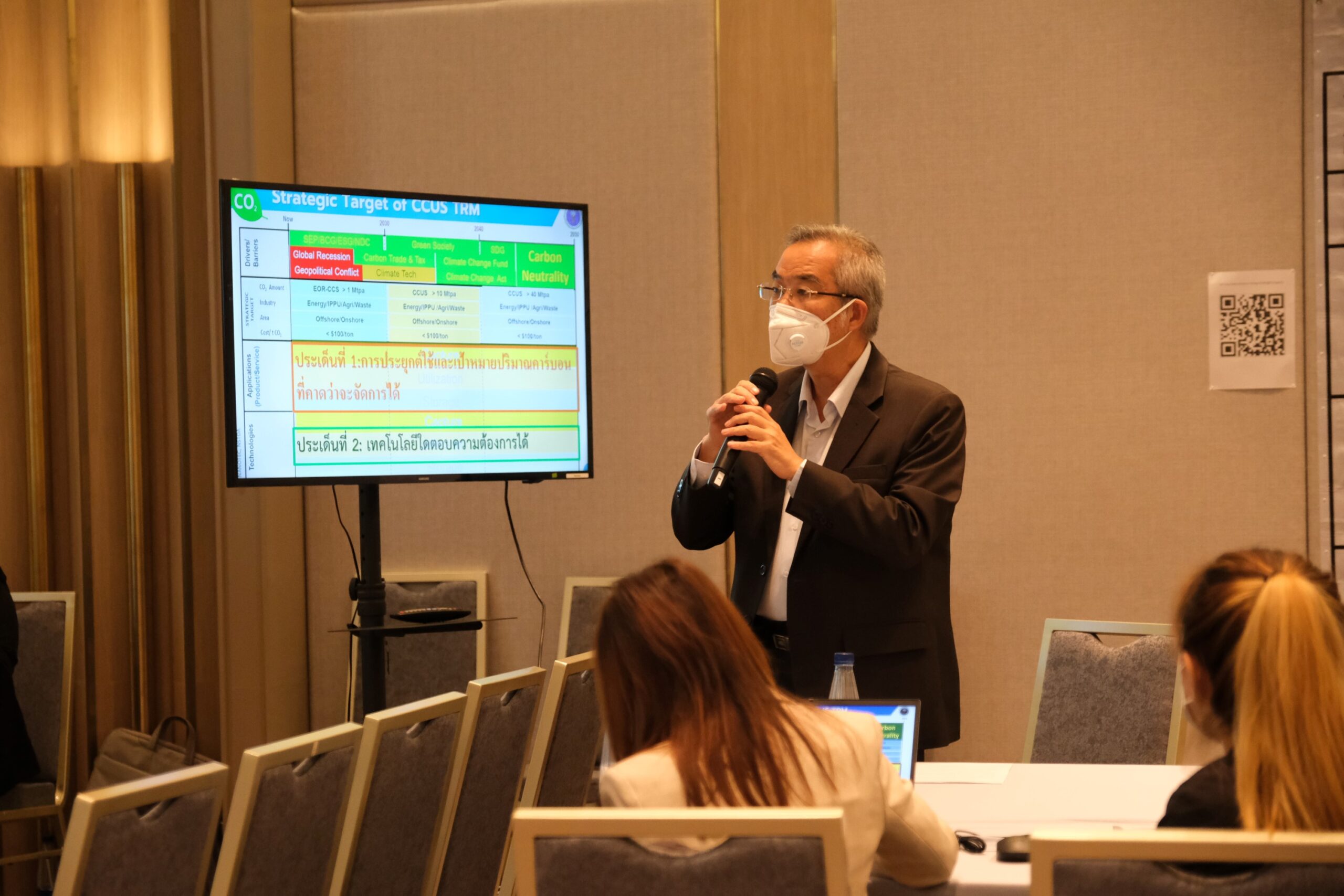 และกิจกรรมไฮไลท์ของงานที่สำคัญได้แก่ การระดมสมองเพื่อกำหนดเป้าหมายเชิงกลยุทธ์ของ CCUS TRM รวมทั้งการวิเคราะห์ application หรือการประยุกต์ใช้เทคโนโลยี CCUS และเป้าหมายปริมาณคาร์บอนที่คาดว่าจะจัดการได้ ตลอดจนการวิเคราะห์เทคโนโลยี CCUS ทั้ง CCS และ CCU ที่สามารถตอบความต้องการ application นั้นๆ ได้ ซึ่งช่วงกิจกรรมดังกล่าว นำโดย รศ.ดร.ณัฐสิทธิ์ เกิดศรี วิทยาลัยการจัดการ มหาวิทยาลัยมหิดล ผู้เชี่ยวชาญด้านการจัดทำ TRM และ ดร.สุธี ผู้เจริญชนะชัย รองผู้อำนวยการศูนย์นาโนเทคโนโลยีแห่งชาติ สวทช. ในฐานะผู้แทนคณะวิจัย
