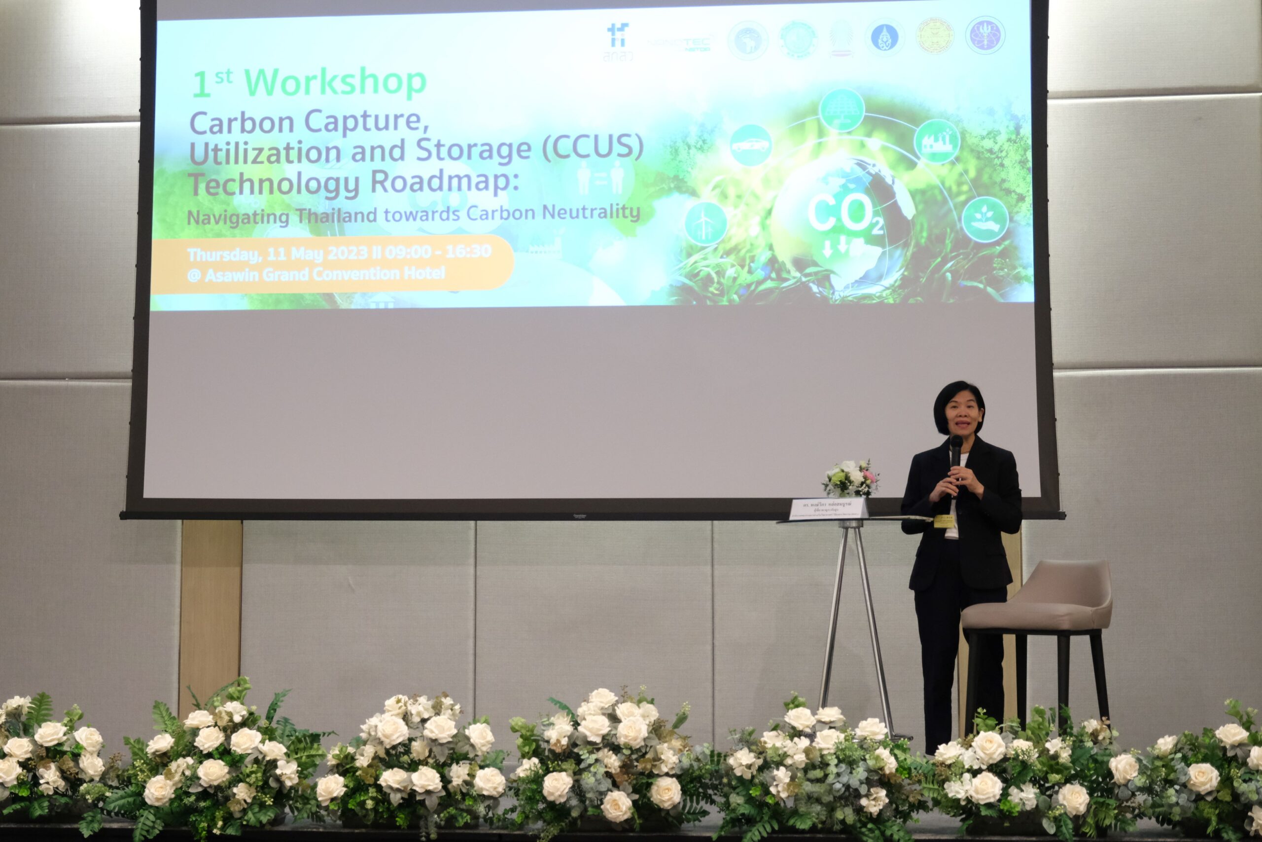 เมื่อวันที่ 11 พฤษภาคม 2566 ณ โรงแรมอัศวิน แกรนด์ คอนเวนชั่น - ศูนย์นาโนเทคโนโลยีแห่งชาติ (นาโนเทค) สำนักงานพัฒนาวิทยาศาสตร์และเทคโนโลยีแห่งชาติ (สวทช.) นำโดย ดร.วรรณี ฉินศิริกุล ผู้อำนวยการ ร่วมกับเครือข่ายพันธมิตร จัดการสัมมนาเชิงปฏิบัติการ "Carbon Capture, Utilization and Storage (CCUS) Technology Roadmap" Navigating Thailand towards Carbon Neutrality ครั้งที่ 1 โดยการสนับสนุนจากสำนักงานคณะกรรมการส่งเสริมวิทยาศาสตร์ วิจัย และนวัตกรรม (สกสว.) ซึ่งได้รับเกียรติจาก ดร. พงษ์วิภา หล่อสมบูรณ์ ผู้เชี่ยวชาญระดับสูงด้านสิ่งแวดล้อม จาก สกสว. เป็นผู้กล่าวเปิดงาน พร้อมทั้งหน่วยงานผู้เข้าร่วมกิจกรรมทั้งจากภาครัฐ ภาคเอกชน และหน่วยงานรัฐวิสาหกิจ กว่า 52 หน่วยงาน รวมผู้เข้าร่วมราว 150 คน