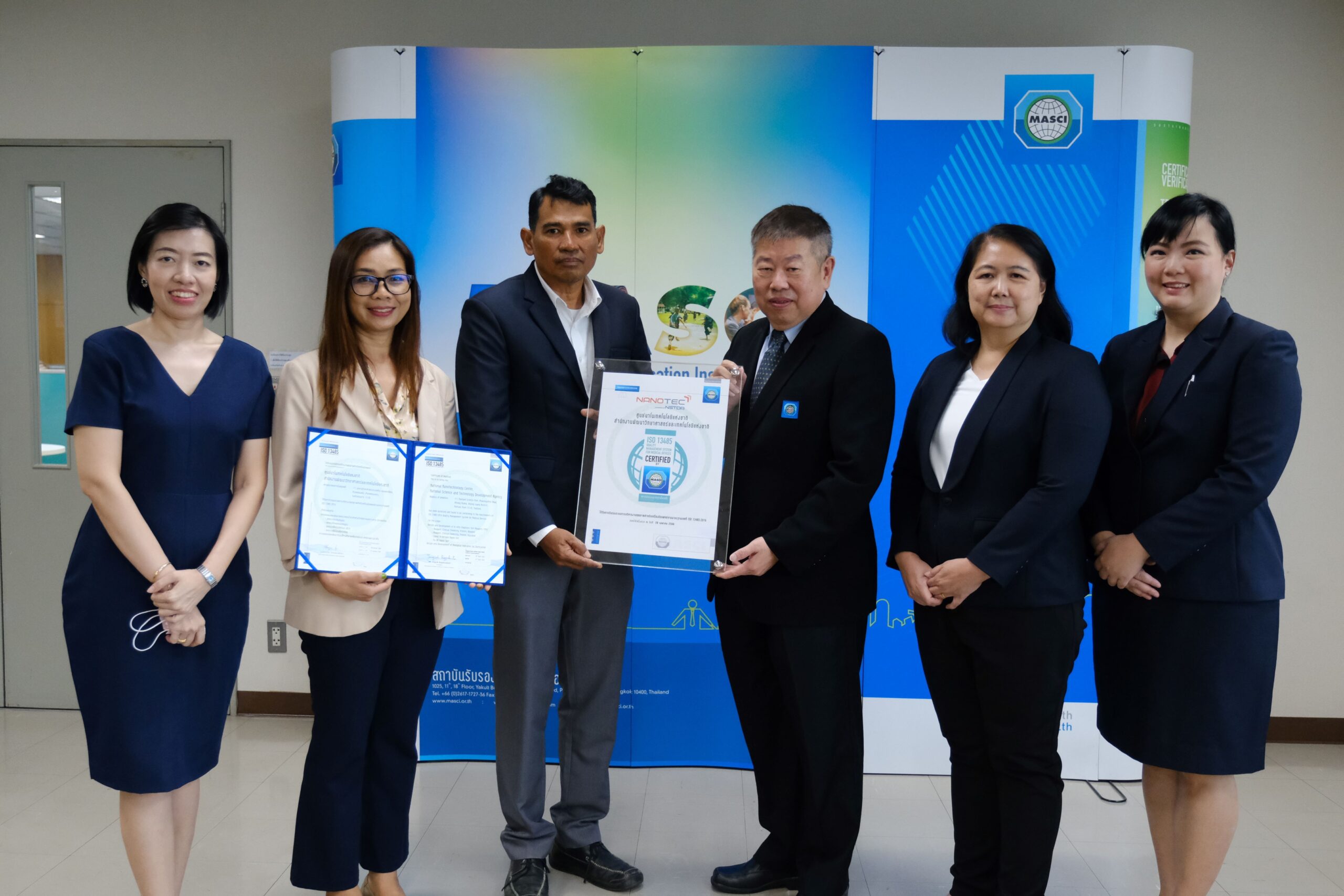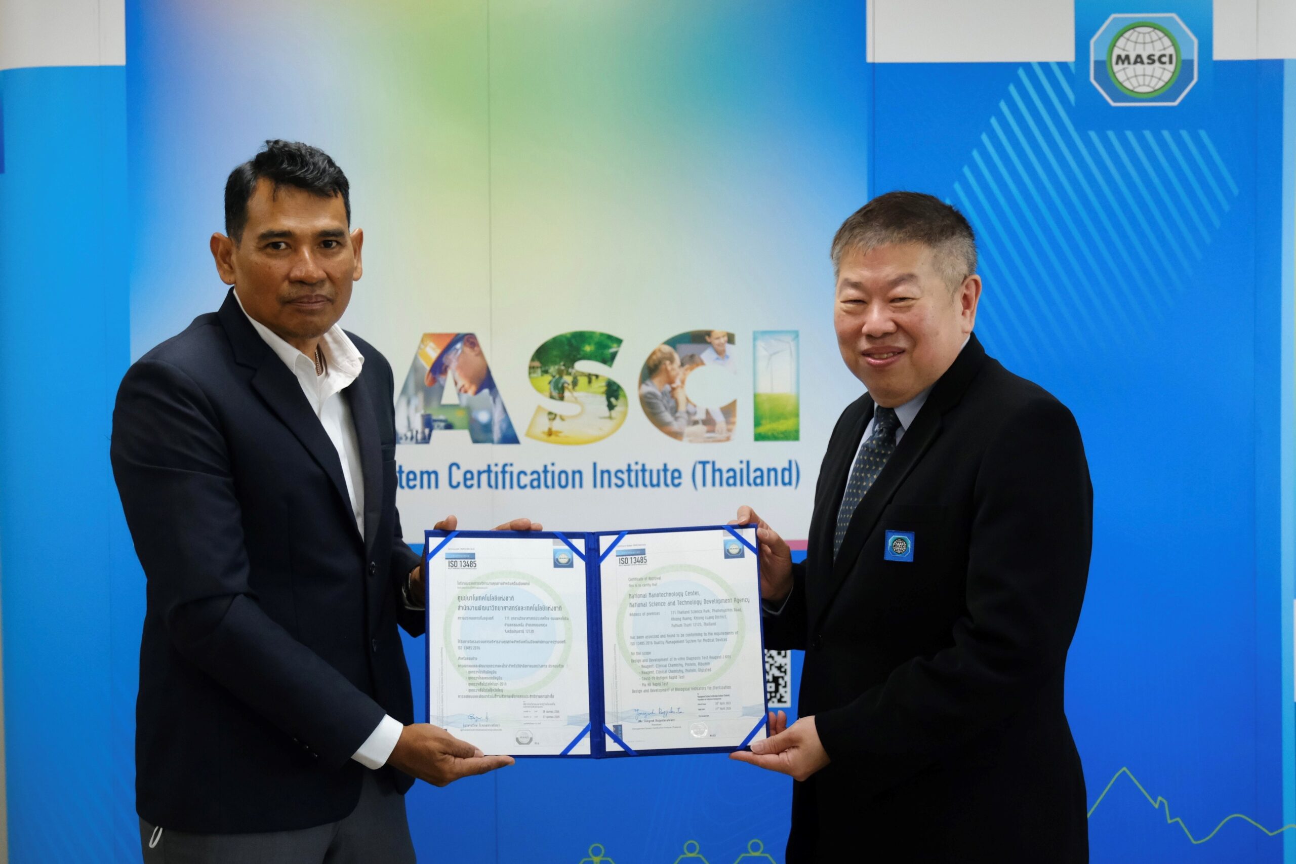 8 มิถุนายน 2566 ณ สถาบันรับรองมาตรฐานไอเอสโอ - ผศ. ดร. ธนากร โอสถจันทร์ รักษาการรองผู้อำนวยการศูนย์นาโนเทคโนโลยีแห่งชาติ (นาโนเทค) สำนักงานพัฒนาวิทยาศาสตร์เทคโนโลยีแห่งชาติ (สวทช.) เป็นตัวแทนรับมอบใบรับรองระบบบริหารงานคุณภาพสำหรับเครื่องมือแพทย์ ISO 13485:2016 จากนายจงรักษ์ โรจน์พลาเสถียร ผู้อำนวยการสถาบันรับรองมาตรฐานไอเอสโอ (MASCI) โดยมี ดร. เดือนเพ็ญ จาปรุง ผู้อำนวยการกลุ่มวิจัยวัสดุตอบสนองและเซ็นเซอร์ระดับนาโน, ดร. ณัฐปภัสร วิริยะชัยพร และดร. จีราพร ลีลาวัฒนชัย จากทีมวิจัยวัสดุตอบสนองระดับนาโน พร้อมด้วย นางสุดา สินสุวรรณรักษ์ ผู้จัดการงานระบบคุณภาพ ความปลอดภัย อาชีวอนามัย และสิ่งแวดล้อม นาโนเทค สวทช. เข้าร่วมรับมอบ