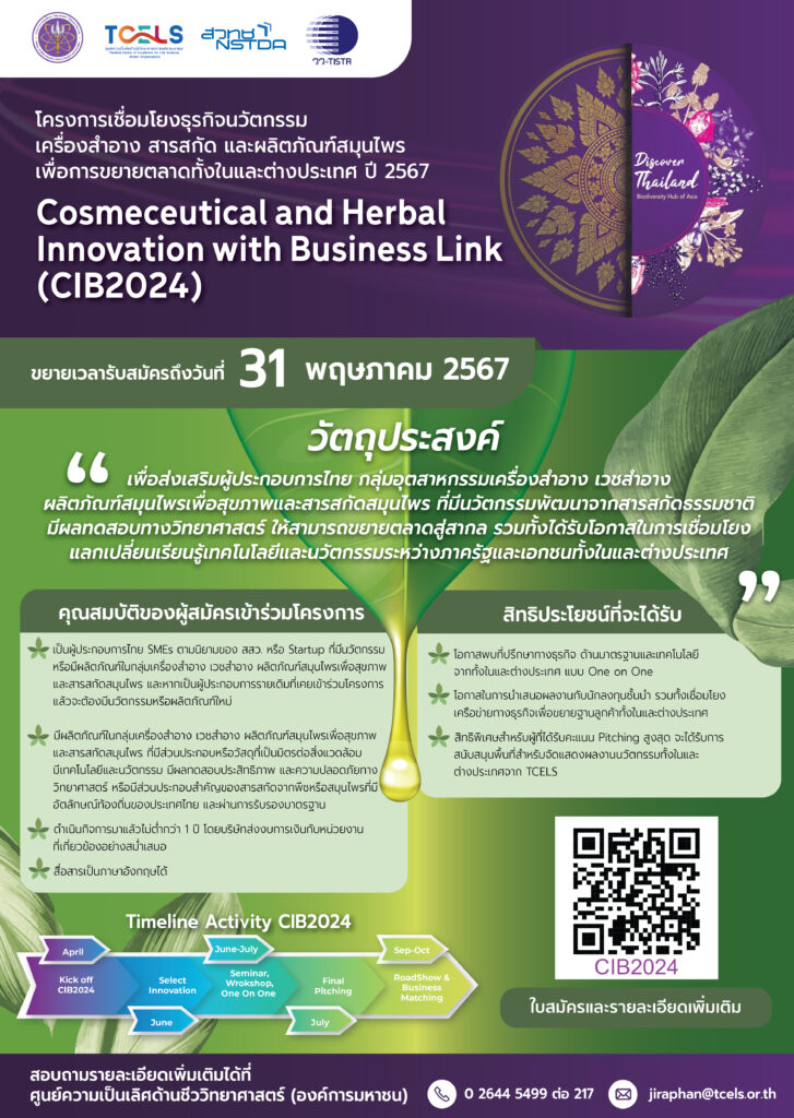 ขยายเวลารับสมัครถึง พค. 67 นี้ Startup ก็มาได้ !! กับโครงการ CIB2024 ที่สำนักงานพัฒนาวิทยาศาสตร์และเทคโนโลยีแห่งชาติ (สวทช.) ร่วมกับ ศูนย์ความเป็นเลิศด้านชีววิทยาศาสตร์ (องค์การมหาชน) (ศลช.) และสถาบันวิจัยวิทยาศาสตร์และเทคโนโลยีแห่งประเทศไทย (วว.) เชิญชวนผู้ประกอบการในกลุ่มเครื่องสำอาง เวชสำอาง ผลิตภัณฑ์สมุนไพรเพื่อสุขภาพที่มีนวัตกรรมพัฒนาจากสารสกัดธรรมชาติ มีผลทดสอบประสิทธิภาพเเละความปลอดภัยทางวิทยาศาสตร์ เข้าร่วม โครงการเชื่อมโยงธุรกิจนวัตกรรมเครื่องสำอาง สารสกัดและผลิตภัณฑ์สมุนไพรเพื่อการขยายตลาดทั้งในและต่างประเทศ ” ประจำปี 2567″ (Cosmeceutical and Herbal Innovation with Business Link ; CIB2024)
