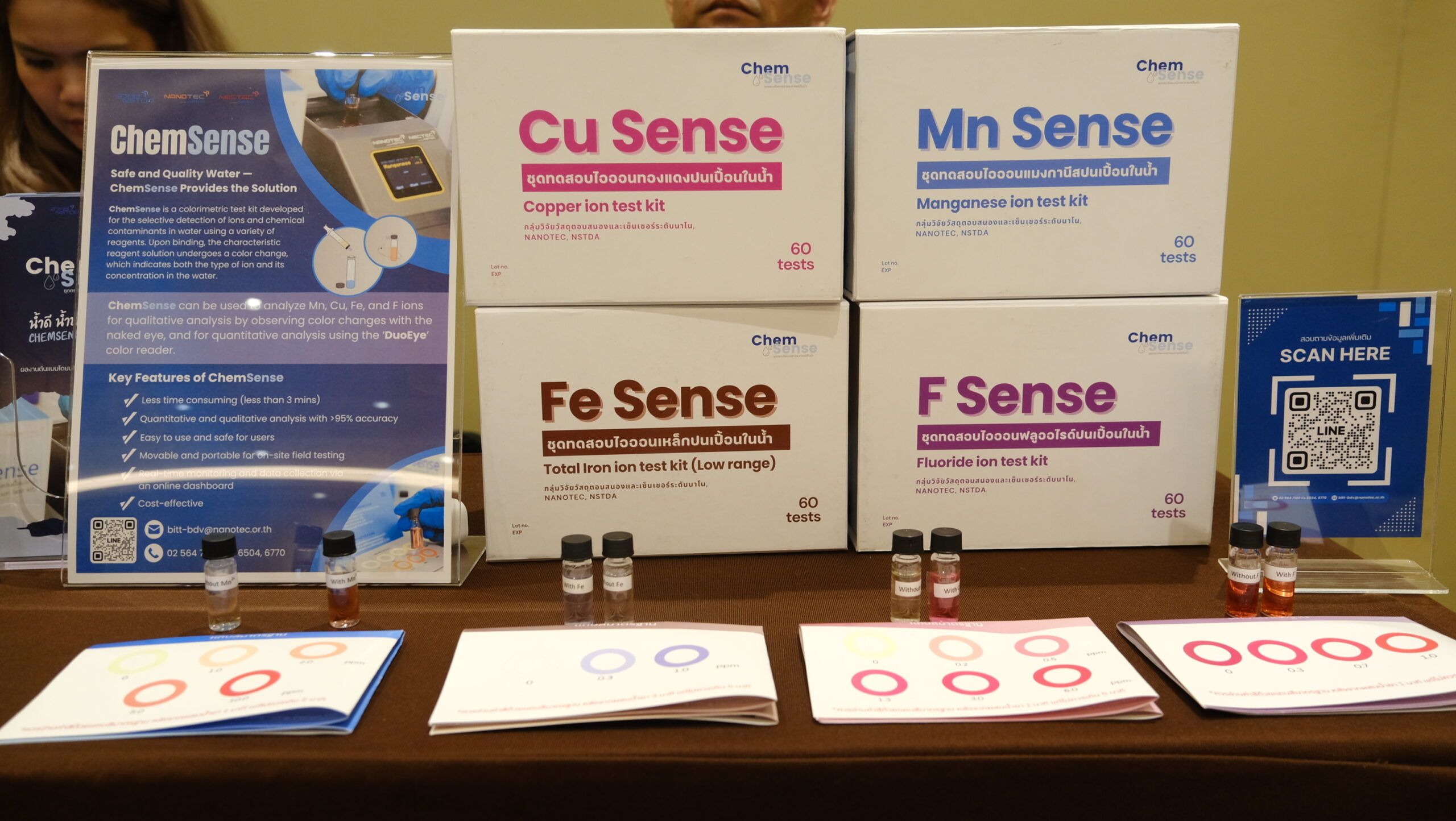 ภายในงานทีมวิจัยนาโนเทค ได้เข้าร่วมเป็นวิทยากรบรรยายในหัวข้อ “การนำเทคโนโลยีจากการวิจัยและพัฒนาของไทยมาประยุกต์ใช้ในระบบประปา” พร้อมนำเสนอนิทรรศการจัดแสดงผลงานวิจัย “ChemSense ชุดทดสอบสารเคมีปนเปื้อนในน้ำ ได้แก่ แมงกานีส  ทองแดง เหล็ก ฟลูออร์ไรด์” และ “M Sense” ชุดทดสอบการปนเปื้อนโลหะหนักในน้ำ ได้แก่ แคดเมียม ตะกั่ว ปรอท” ซึ่งเป็นนวัตกรรมชุดตรวจการปนเปื้อนโลหะและสารเคมีในน้ำที่ใช้ง่าย รวดเร็ว และแม่นยำ โดยใช้น้ำยาสีเปลี่ยนสีจำเพาะเจาะจง ตรวจสอบได้ด้วยตาเปล่า หรือใช้ร่วมกับเครื่องอ่านสีพกพา DuoEye Reader เพื่อแสดงค่าตัวเลขแม่นยำในเชิงปริมาณ โดยจุดเด่นของการพัฒนานวัตกรรมชุดทดสอบนี้ คือมีการออกแบบให้ใช้งานง่าย เพียงผู้ทดสอบเก็บตัวอย่างน้ำมาใส่ในขวดทดลองตามปริมาณที่กำหนด เติมน้ำยาทดสอบลงในขวดแล้วรอเวลาเพียง 3-5นาที สามารถนำไปใช้ตรวจวัดโลหะและเคมีปนเปื้อนในน้ำในระดับภาคสนาม  เพื่อช่วยลดภาระงานให้แก่เจ้าหน้าที่ และยังสามารถนำไปเป็นเครื่องมือให้ประชาชนใช้ติดตามการปนเปื้อนของโลหะด้วยตนเองได้อีกด้วย