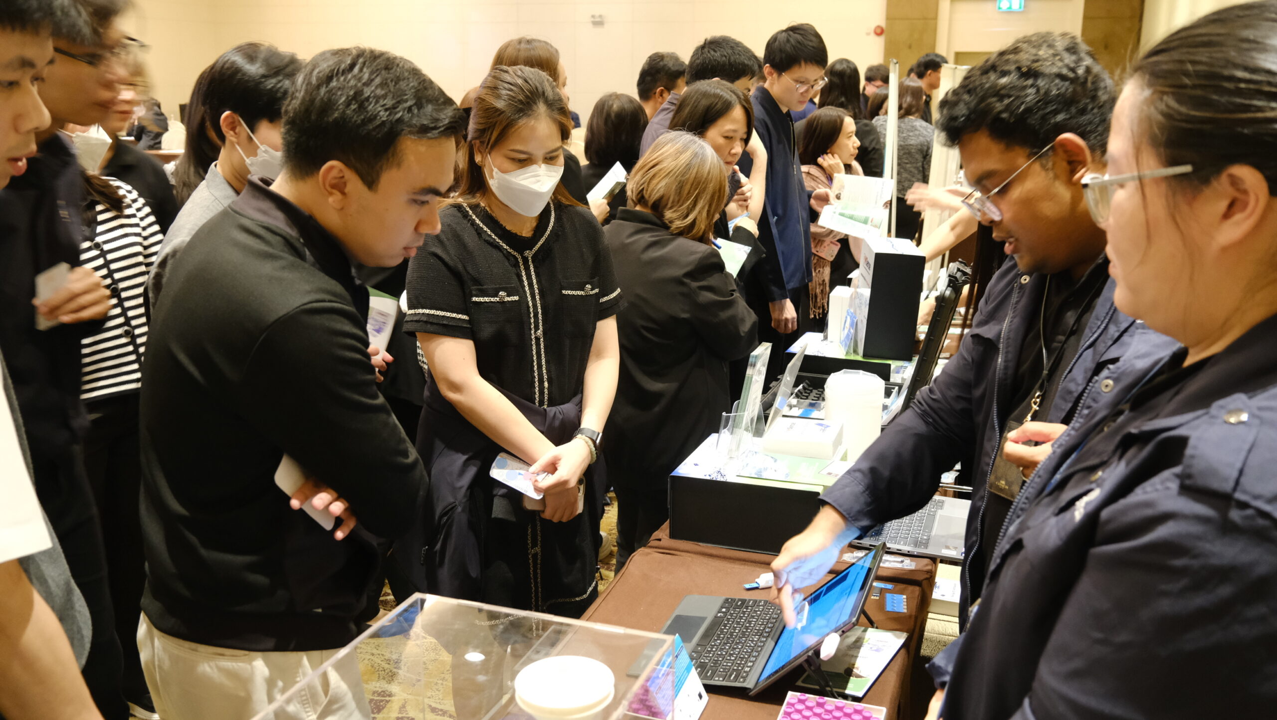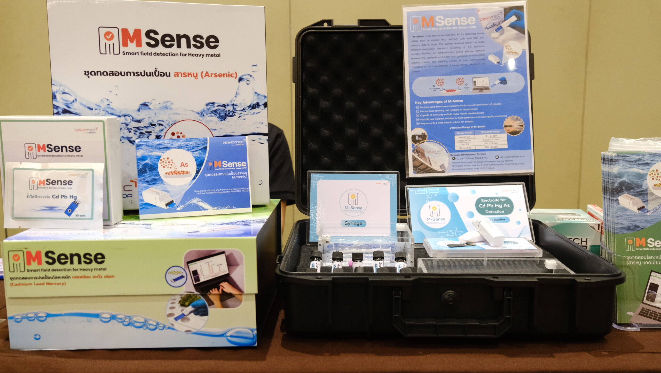ภายในงานทีมวิจัยนาโนเทค ได้เข้าร่วมเป็นวิทยากรบรรยายในหัวข้อ “การนำเทคโนโลยีจากการวิจัยและพัฒนาของไทยมาประยุกต์ใช้ในระบบประปา” พร้อมนำเสนอนิทรรศการจัดแสดงผลงานวิจัย “ChemSense ชุดทดสอบสารเคมีปนเปื้อนในน้ำ ได้แก่ แมงกานีส  ทองแดง เหล็ก ฟลูออร์ไรด์” และ “M Sense” ชุดทดสอบการปนเปื้อนโลหะหนักในน้ำ ได้แก่ แคดเมียม ตะกั่ว ปรอท” ซึ่งเป็นนวัตกรรมชุดตรวจการปนเปื้อนโลหะและสารเคมีในน้ำที่ใช้ง่าย รวดเร็ว และแม่นยำ โดยใช้น้ำยาสีเปลี่ยนสีจำเพาะเจาะจง ตรวจสอบได้ด้วยตาเปล่า หรือใช้ร่วมกับเครื่องอ่านสีพกพา DuoEye Reader เพื่อแสดงค่าตัวเลขแม่นยำในเชิงปริมาณ โดยจุดเด่นของการพัฒนานวัตกรรมชุดทดสอบนี้ คือมีการออกแบบให้ใช้งานง่าย เพียงผู้ทดสอบเก็บตัวอย่างน้ำมาใส่ในขวดทดลองตามปริมาณที่กำหนด เติมน้ำยาทดสอบลงในขวดแล้วรอเวลาเพียง 3-5นาที สามารถนำไปใช้ตรวจวัดโลหะและเคมีปนเปื้อนในน้ำในระดับภาคสนาม  เพื่อช่วยลดภาระงานให้แก่เจ้าหน้าที่ และยังสามารถนำไปเป็นเครื่องมือให้ประชาชนใช้ติดตามการปนเปื้อนของโลหะด้วยตนเองได้อีกด้วย