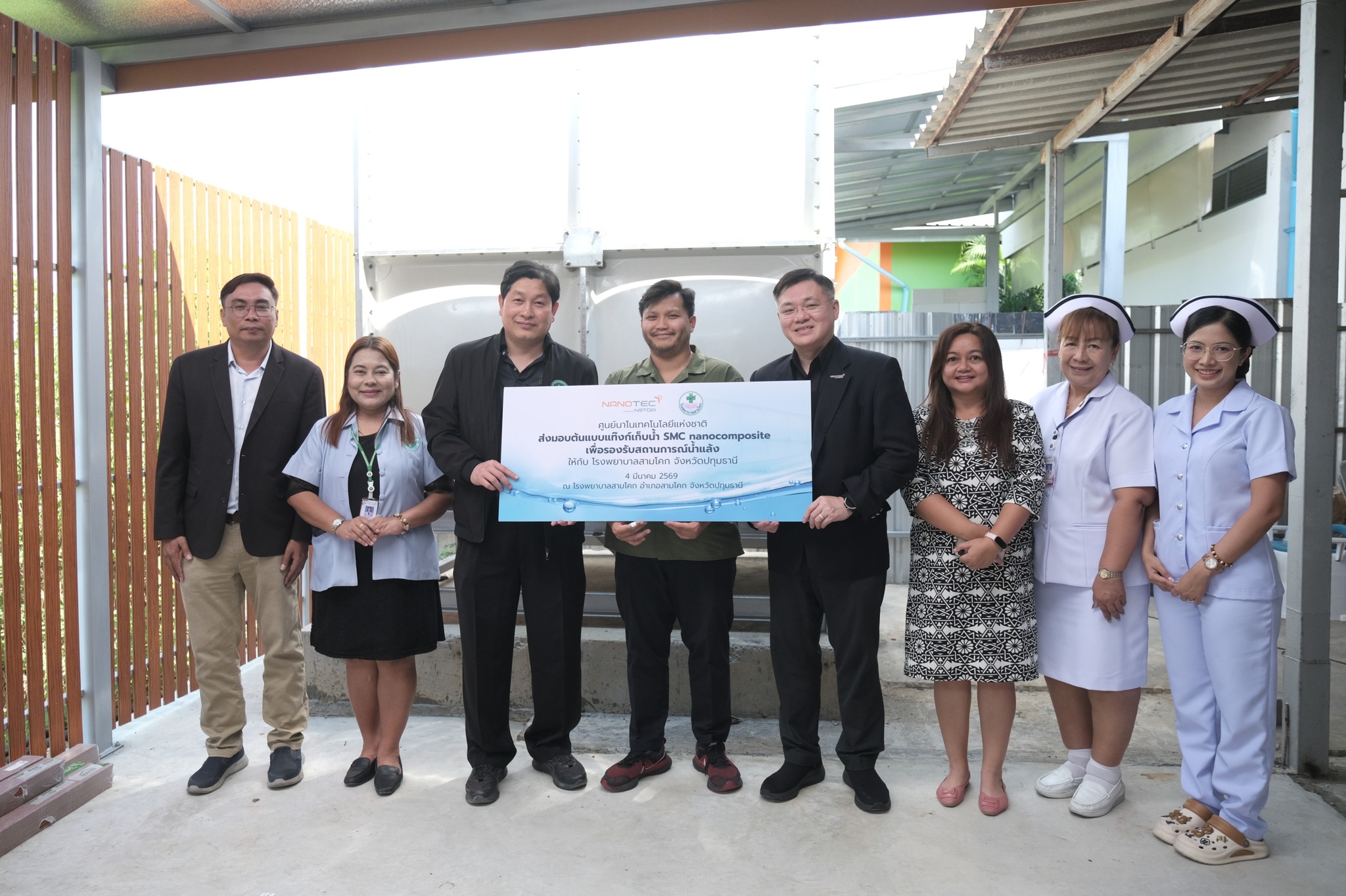 4 มีนาคม 2569 ณ โรงพยาบาลสามโคก จังหวัดปทุมธานี ดร.วิยงค์ กังวานศุภมงคล รองผู้อำนวยการศูนย์นาโนเทคโนโลยีแห่งชาติ ดร.สมประสงค์ ทองคำ นักวิจัยกลุ่มวิจัยวัสดุผสมและกระบวนการนาโน ส่งมอบ“นวัตกรรมต้นแบบแท๊งก์เก็บน้ำ SMC จากวัสดุ nanocomposite” สำหรับการอุปโภคและบริโภครองรับสถานการณ์น้ำแล้งสำหรับโรงพยาบาลสามโคก จังหวัดปทุมธานี ขนาดความจุ 8 ลูกบาศก์เมตร โดยนายแพทย์จตุพงษ์ จันทร์ทอง รองนายแพทย์สาธารณสุขจังหวัดปทุมธานี และรักษาการผู้อำนวยการโรงพยาบาลสามโคก เป็นผู้รับมอบ
